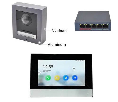 7" touchscreen display. This touchscreen allows you to answer a visitor's doorbell. It connects to the network via Wi-Fi or PoE using the DS-3E0105P-E/M switch.